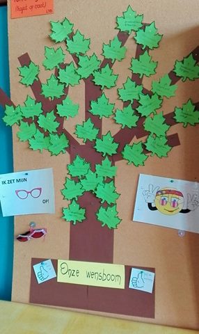 Maak vooraf uit stevig karton een boom of gebruik een echte boom (bv.: kerst- of paasboom) en geef hem een zichtbare plaats. Knip de boomblaadjes uit waarop de kinderen hun wensen schrijven.